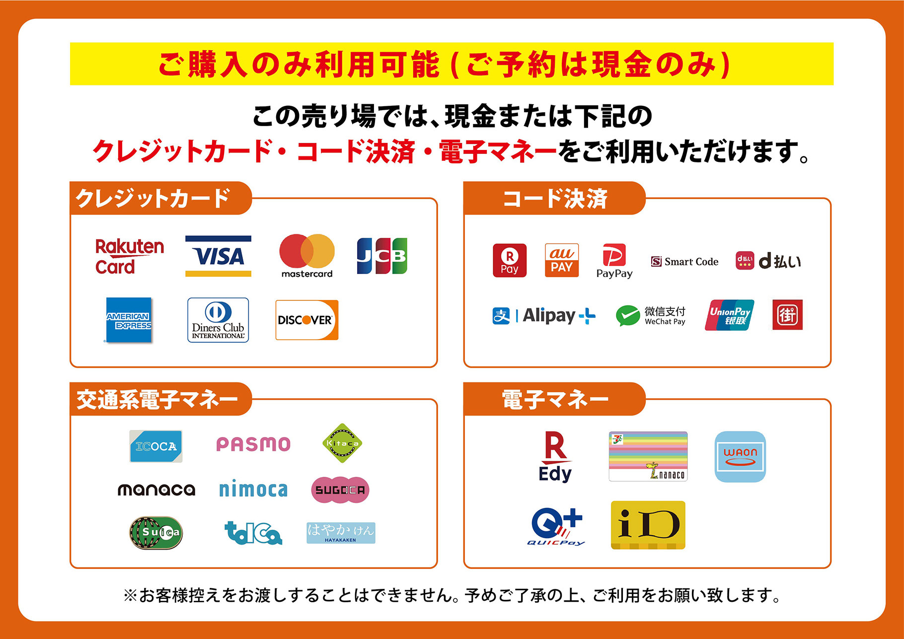 グッズ「当日販売」の売場では現金のほか、クレジットカード・交通系電子マネー・QRコード決済のご利用が可能となります。