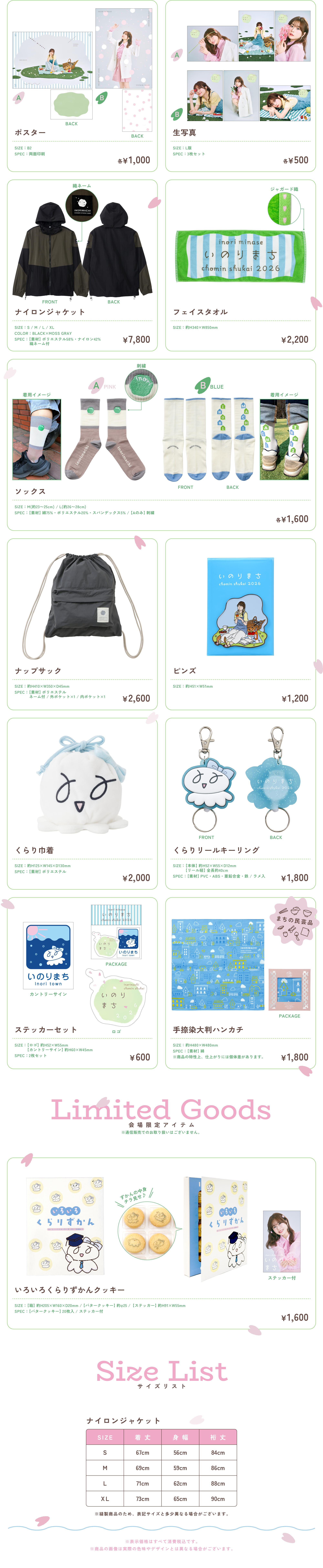 - inori minase オンライングッズショップにて販売中の『カレンダー2026』も、イベントグッズと同時にご注文いただけます。ただし、イベントグッズと同梱での発送となります。あらかじめご了承ください。